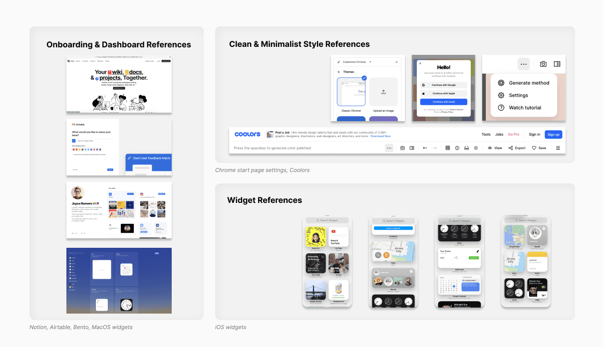 To improve upon existing start pages, I chose a modern theme that was clean and minimalist. The main dashboard page was inspired by Bento, and I referenced iOS widget designs.