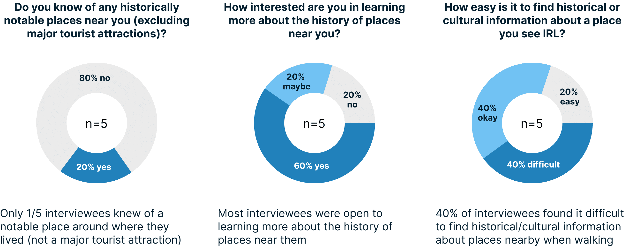 To identify user issues with current ways of learning more about the world while traveling, I interviewed 5 subjects to determine key issues. I defined 'during travel' in this case as physically walking while exploring a place.