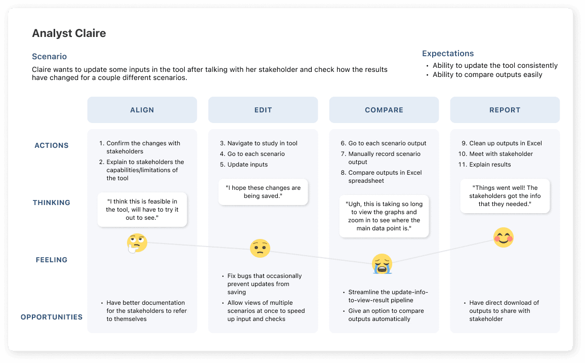 Since the tool contained many sections, it was important to figure out where the pain points existed. Interviews indicated that most issues were concentrated in sections where users edited inputs and compared outputs of the model.