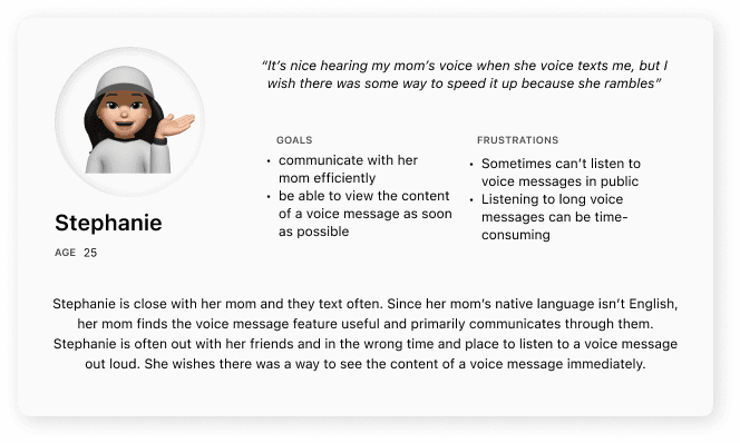 I created two user flows to address the issues of limited playback controls and the lack of a transcription feature. Through these features, users are able to both listen and read voice messages at their own convenience, thus eliminating the need for a quiet place to listen to voice messages as well an extreme amount of time to listen to long ones.
