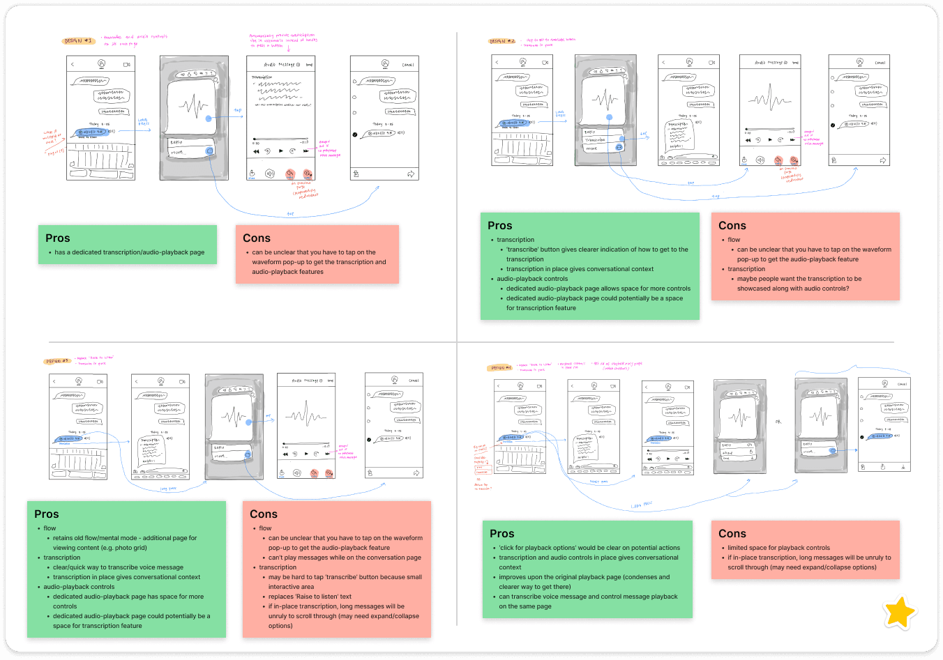 With existing mental models of how similar features work in voicemail and voice memo apps in mind, I created 4 variations of user flows: